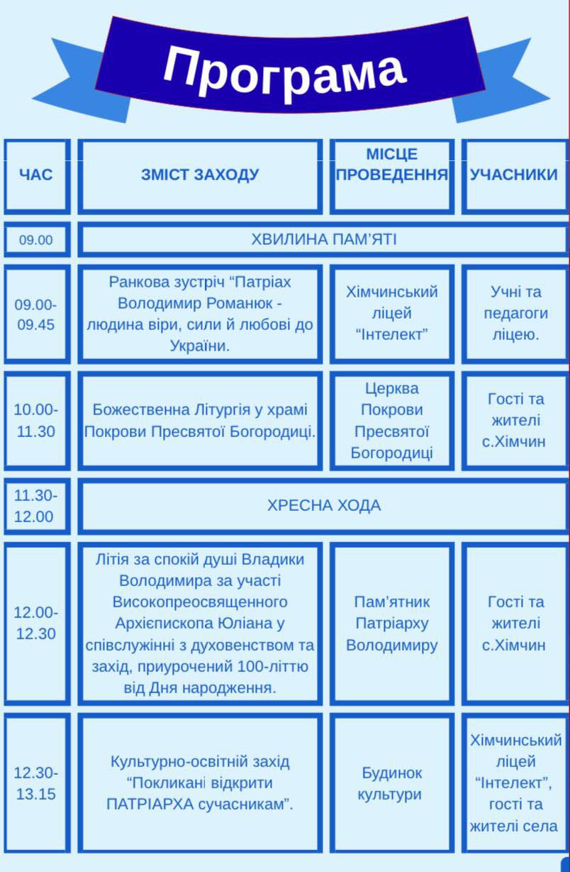 Основна подія тижня- відзначення 100- річчя з дня народження Патріарха Володимира, уродженця нашого села, який став прикладом стійкості, громадянської свідомості, духовним дороговказом для нас.