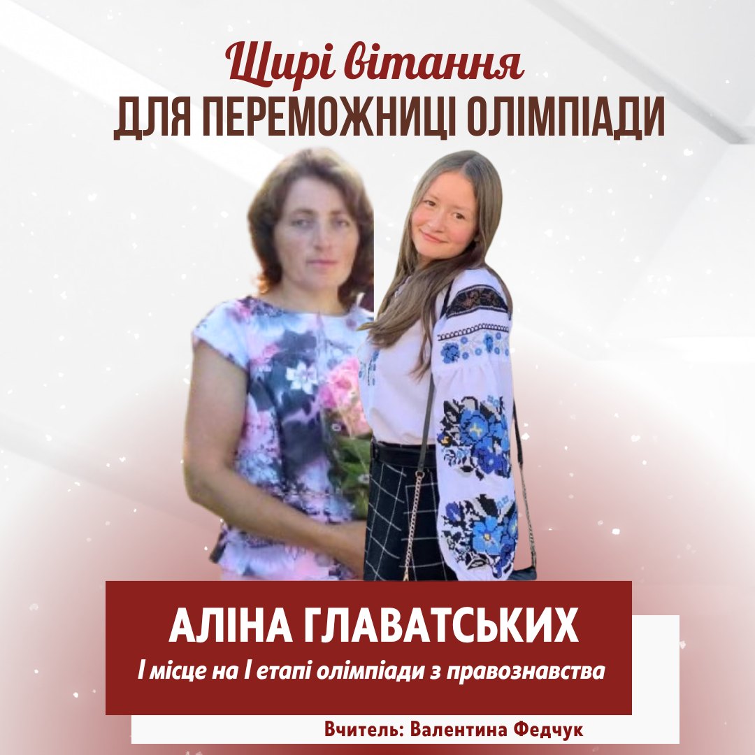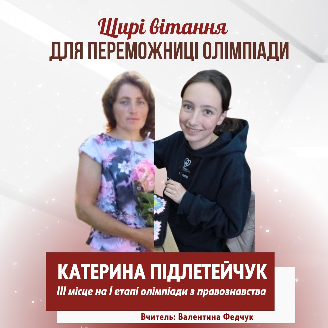 Вітаємо наших юних правників — переможців олімпіади з правознавства! Главатських Аліна, 9-Б клас - І місце. Підлетейчук Катерина , 10 клас - ІІІ місце Учитель Федчук В.В. Ви довели, що знання законів — це сила! Висловлюємо щиру вдячність учителю правознавства Валентині Василівні за мудре наставництво, терпіння та віру в учнів!! Ваша праця — це приклад справжньої педагогічної майстерності!