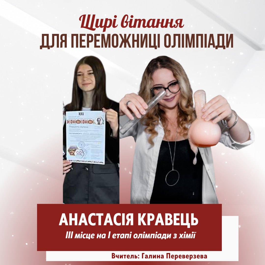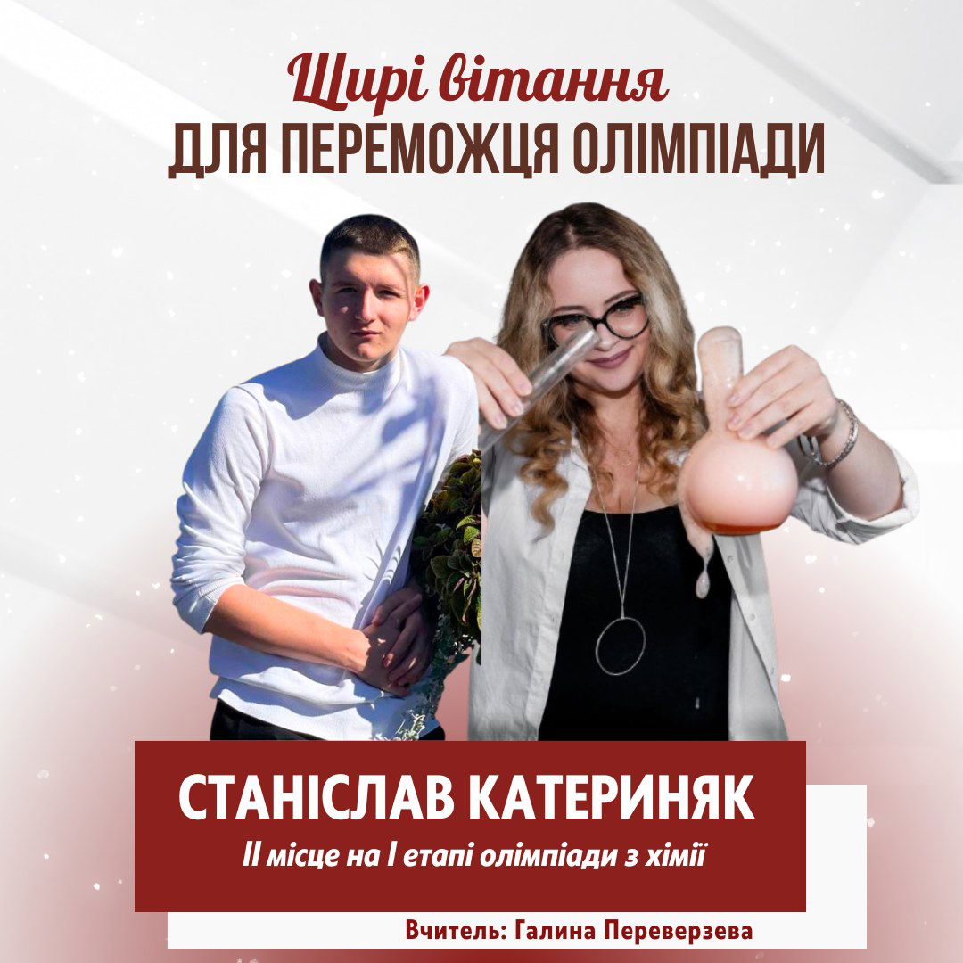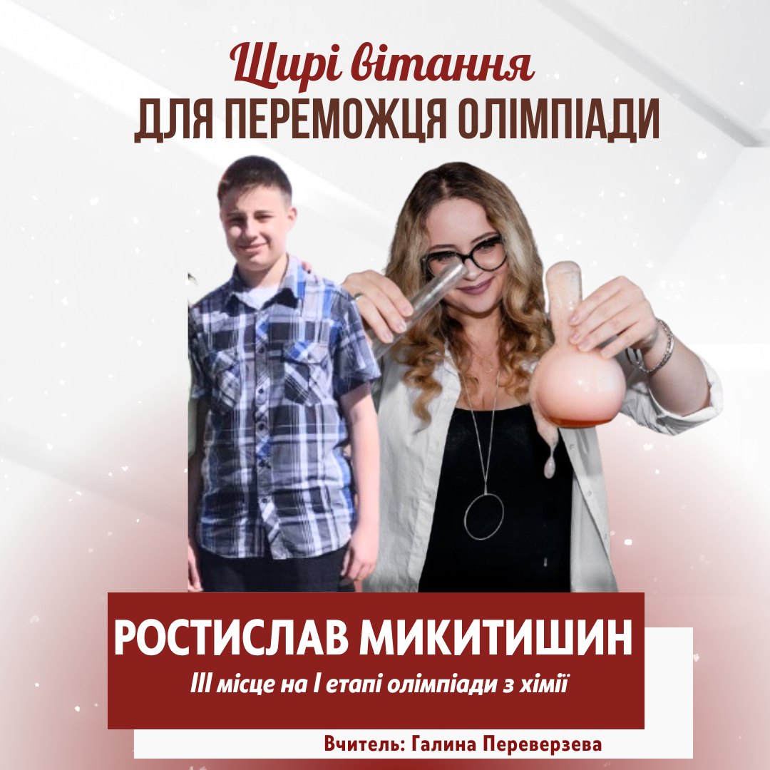 Микитишин Ростислав, 9-Б клас - ІІІ місце Катериняк Станіслав, 10 клас - ІІ місце Кравець Анастасія, 10 клас - ІІІ місце Учитель Переверзева Г.В. Ви — юні дослідники, які вміють перетворювати знання на перемоги! Хай ваша любов до науки зростає, а кожен дослід приносить радість відкриттів. Щира подяка вчителю-наставнику, який відкрив для учнів захопливий світ хімії!