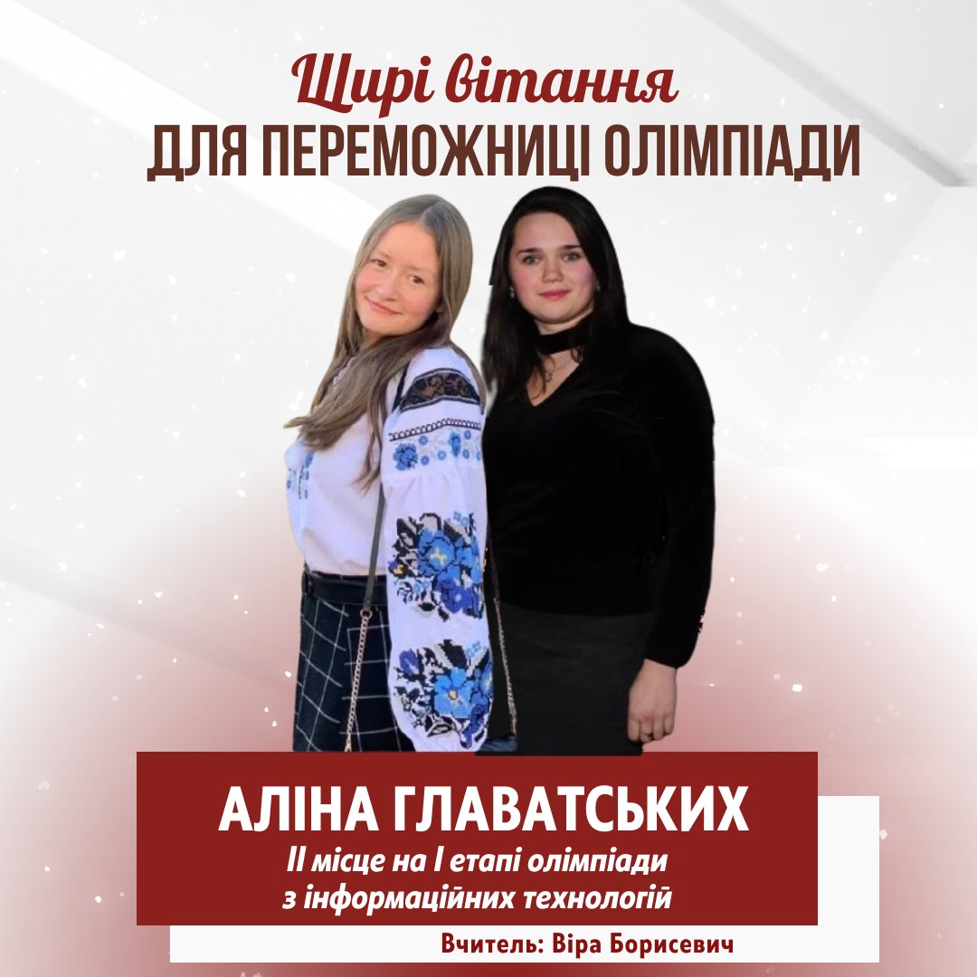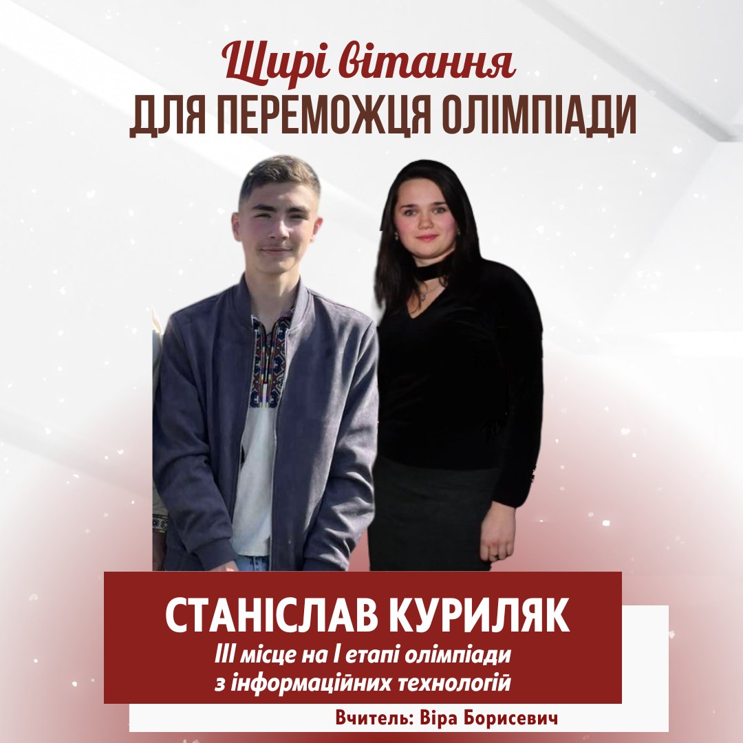 Сучасний світ належить тим, хто вміє мислити творчо, швидко й технологічно!Учні нашого ліцею блискуче продемонстрували свої знання, здобувши перемогу в Олімпіаді з інформаційних технологій. Вітаємо переможців олімпіади з інформаційних технологій. Главатських Аліна, 9-Б - ІІ місце Куриляк Станіслав, 10 клас - ІІІ місце Учитель Борисевич В.М. Щира подяка вчителю-наставнику, яка відкриває для дітей світ цифрових можливостей, навчає логіці, креативу й наполегливості.Ви — справжні провідники у майбутнє! Бажаємо нових відкриттів, натхнення й ще більше перемог!