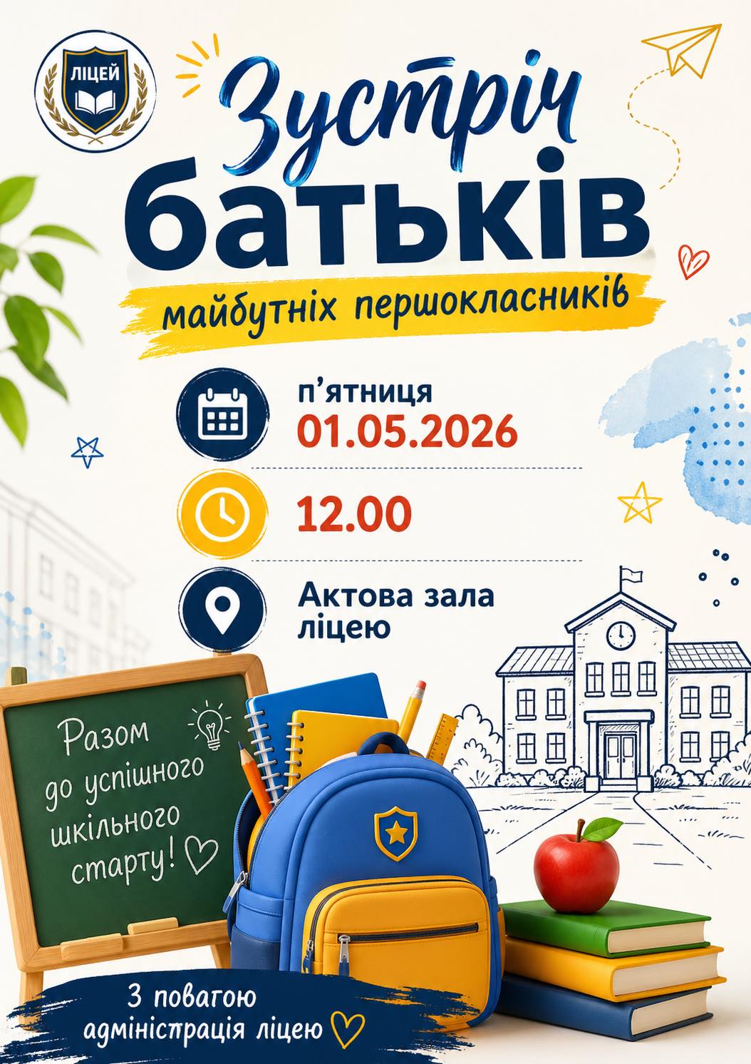 ОГОЛОШЕННЯ!Запрошуємо батьків майбутніх першокласників на зустріч. Дата: пʼятниця, 01.05.2026 Час: 12:00 Місце: актова зала ліцеюБудемо раді вашій присутності!З повагою,адміністрація ліцею
