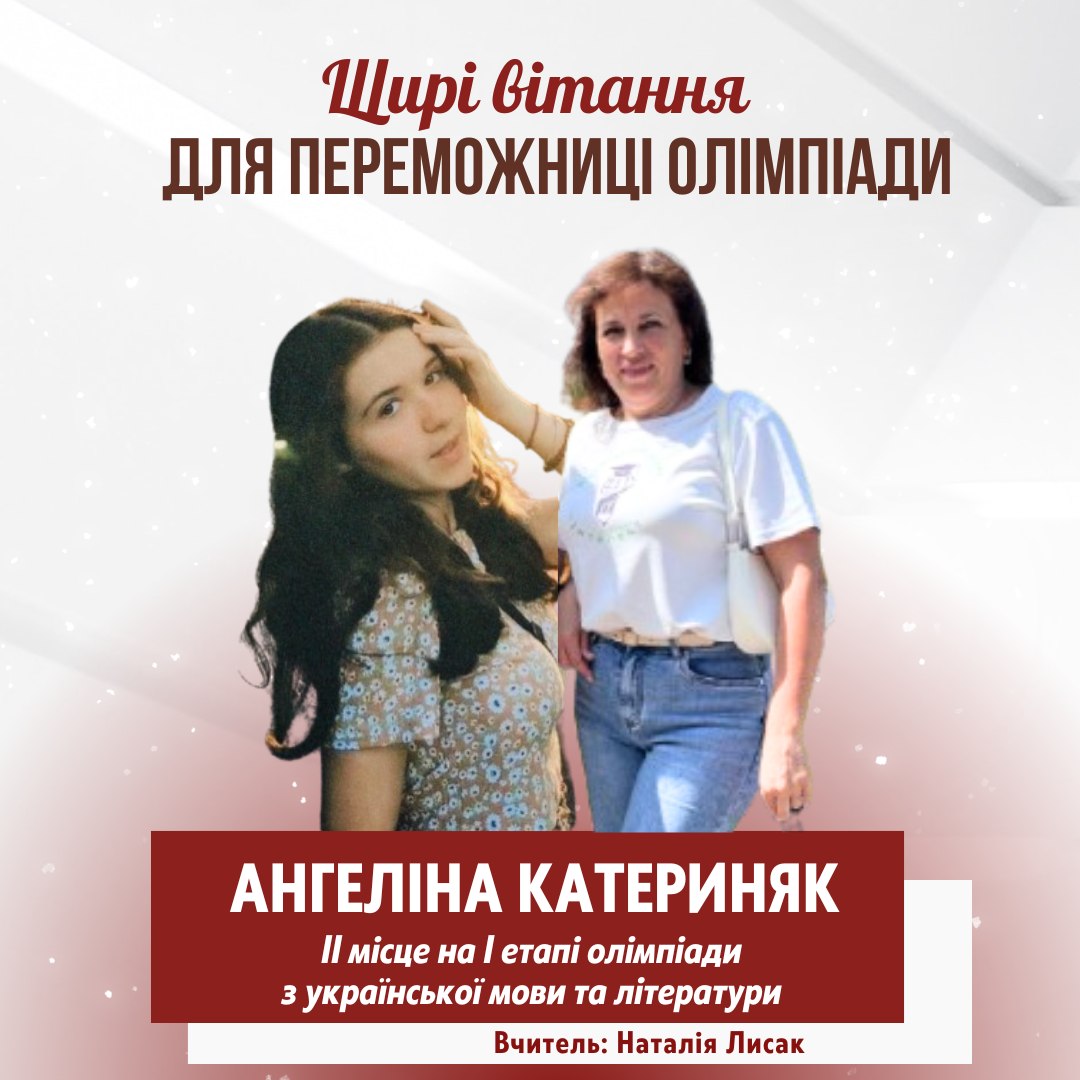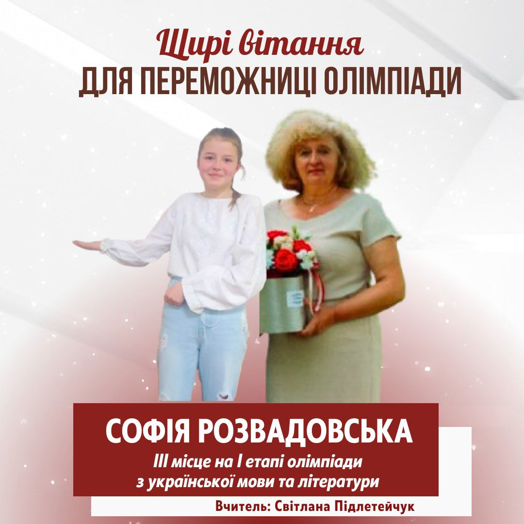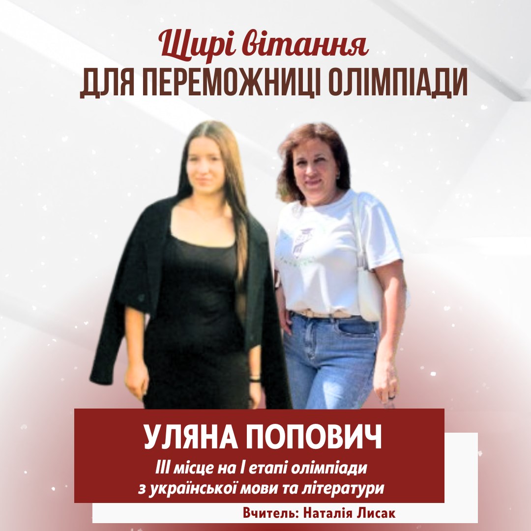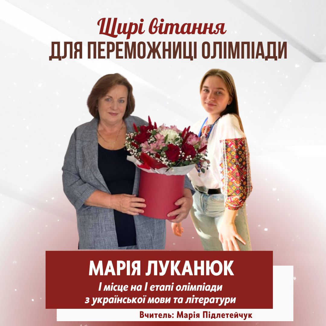 Вітаємо наших юних моволюбів та знавців слова - переможців олімпіади з української мови та літератури Катериняк Ангеліна, 8-А клас - ІІ місце Попович Уляна, 8-А клас - ІІІ місце Учитель Лисак Н.Я. Розвадовська Софія, 9-А клас - ІІІ місце Учитель Підлетейчук С.В. Луканюк Марія, 11-А клас - І місце Учитель Підлетейчук М.Д. Своїми результатами ви довели, що є справжніми майстрами слова! Вітання і вдячність учителям, які підготували переможців! Ви — рушій сили, натхнення й любові до українського слова!